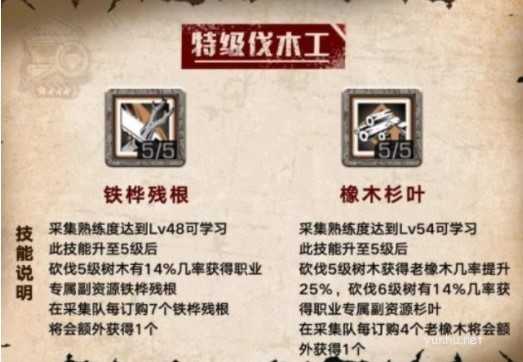 铁桦残根技能带来的专属副资源铁桦残根在前期的需求量很大,能够给萌新带来一定的财富,因此推荐点满这个技能。