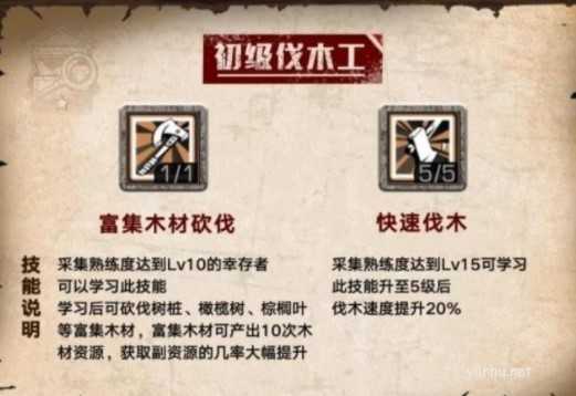 树木是明日大陆最容易获取的资源,而不管是富集木材砍伐带来的概率提升还是快速伐木带来的速度提升,都能提高萌新幸存者前期获取资源的效率,因此非常推荐大家点满这两个技能。