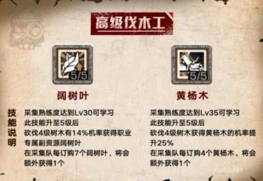 而橡木杉叶技能升至4级时,砍伐6级树木可获得职业专属副资源杉叶,杉叶同样收到很多幸存者的喜爱,因此建议将技能升至4级。