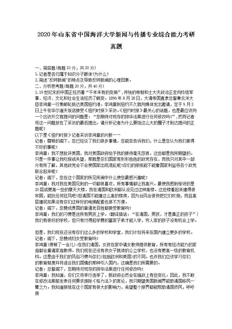 2020年山东省中国海洋大学新闻与传播专业综合能力考研真题(Word版)10-11
