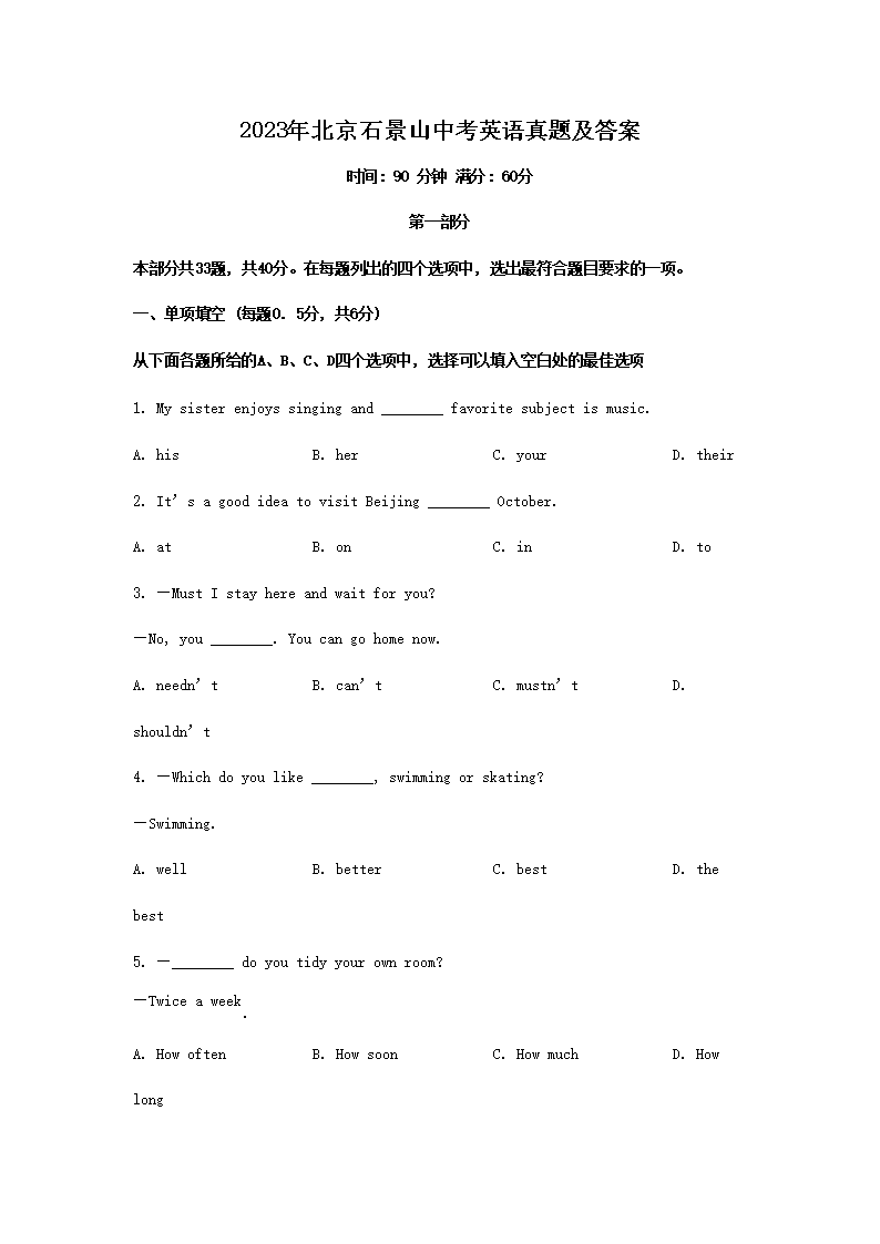 【文档预览】 文档大全网整理发布2023年北京石景山中考英语真题及答案(Word版),前五页预览如下: