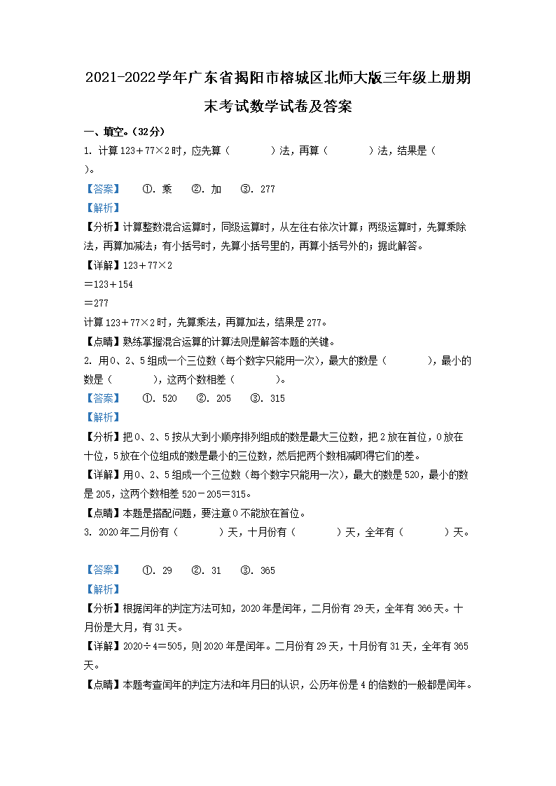 2021-2022学年广东省揭阳市榕城区北师大版三年级上册期末考试数学试卷及答案(Word版)08-25