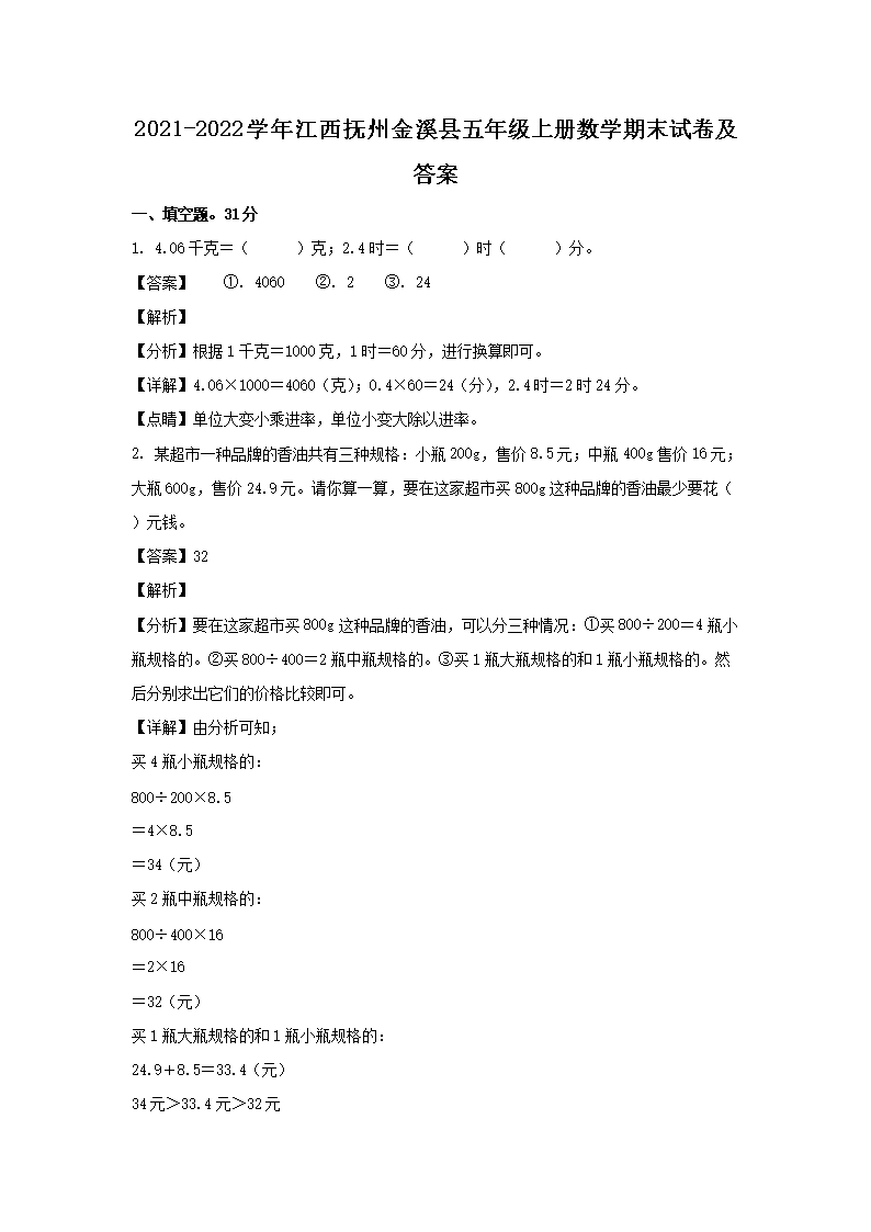 【文档预览】 文档大全网整理发布2021-2022学年江西抚州金溪县五年级上册数学期末试卷及答案(Word版),前五页预览如下:
