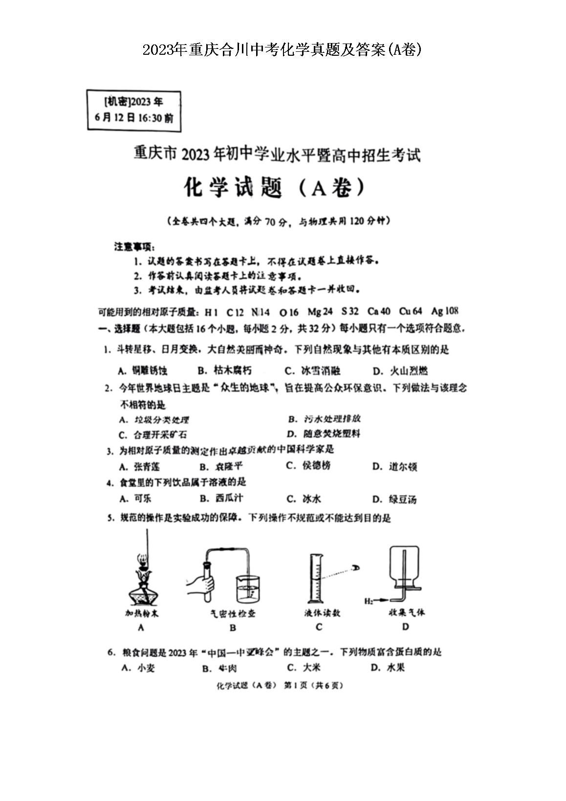 【文档预览】 文档大全网整理发布2023年重庆合川中考化学真题及答案(A卷)(图片版),前五页预览如下: