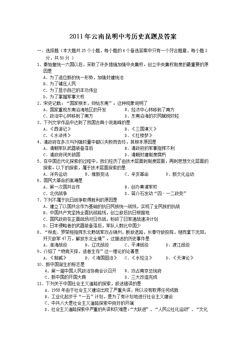 【文档预览】 文档大全网整理发布2011年云南昆明中考历史真题及答案(Word版),前五页预览如下: