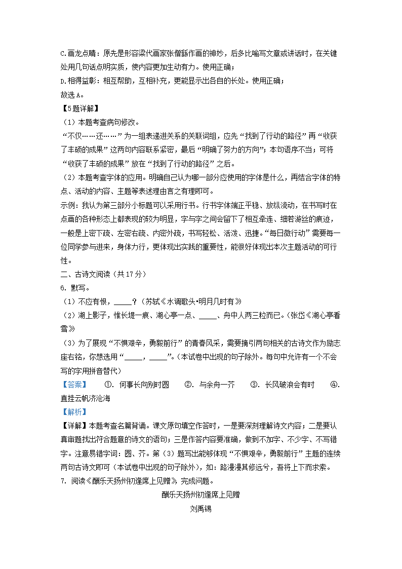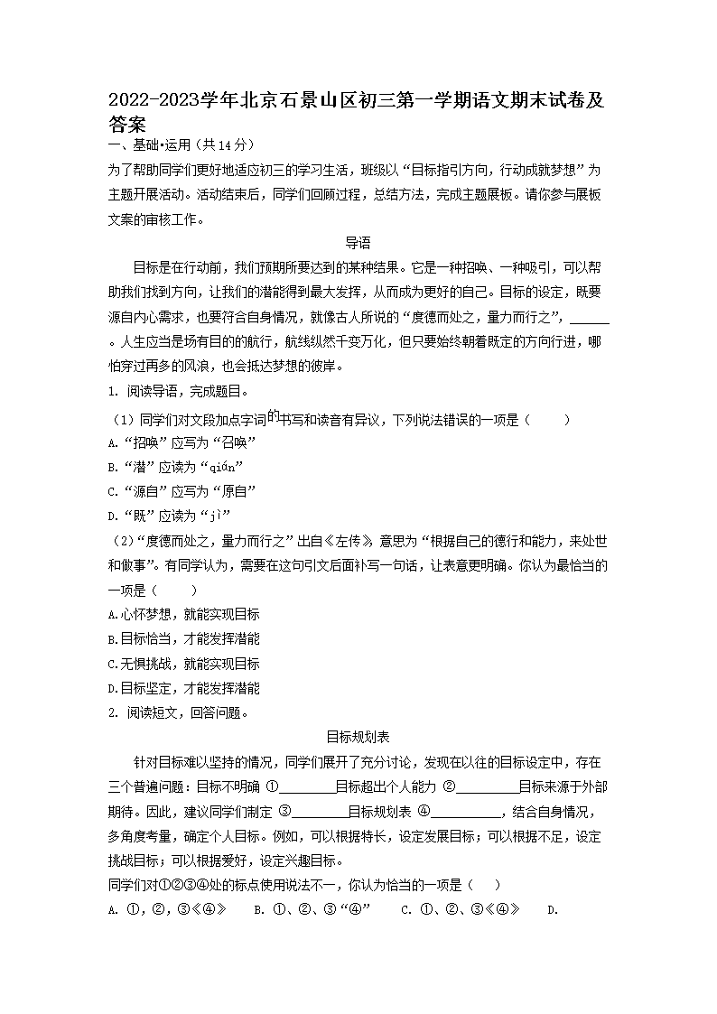 2022-2023学年北京石景山区初三第一学期语文期末试卷及答案(Word版)07-29