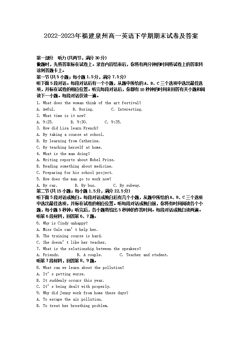 【文档预览】 文档大全网整理发布2022-2023年福建泉州高一英语下学期期末试卷及答案(Word版),前五页预览如下: