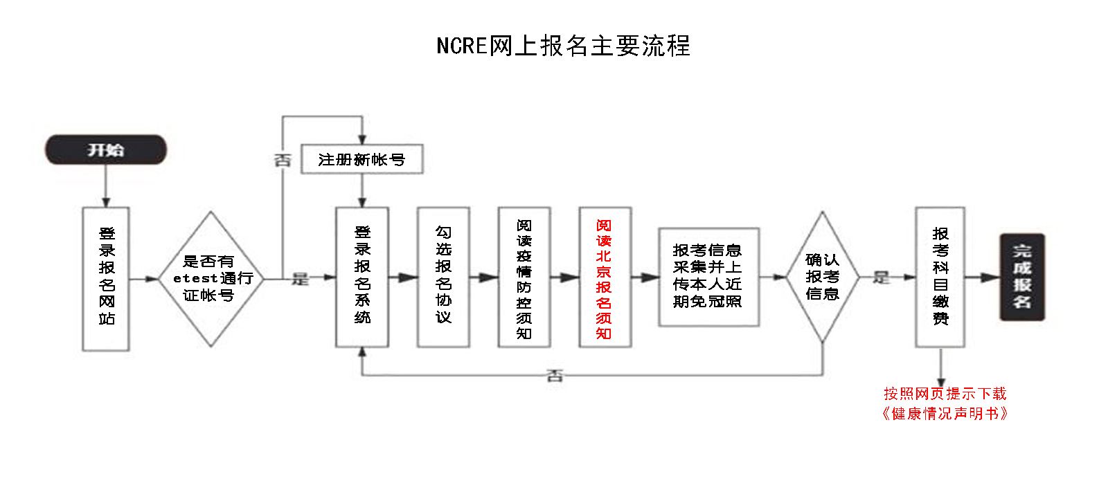 NCRE采取网上报名,报名考务费每科目75元。选择在北京市所属考点进行考试的考生,应登录全国计算机等级考试报名网站(网址:https://ncre-bm.neea.cn),点击“(11)北京市”报名入口进行网上报名。考生登录报名网站后,须认真阅读“省通告:北京市NCRE报名须知”等公告,知悉报名及疫情防控相关事项,并按照网页提示完成信息填写、照片上传和缴费。