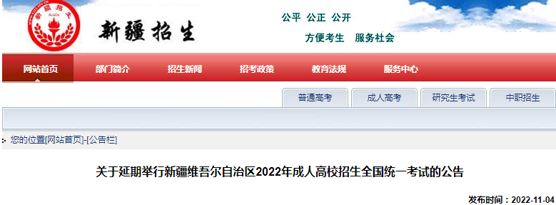 原文标题:关于延期举行新疆维吾尔自治区2022年成人高校招生全国统一考试的公告