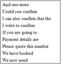 (5)_______ your reservation of one double room for 21st-22nd April. The booking reference is TJ98. (6)___________ on any correspondence and on arrival at the hotel.