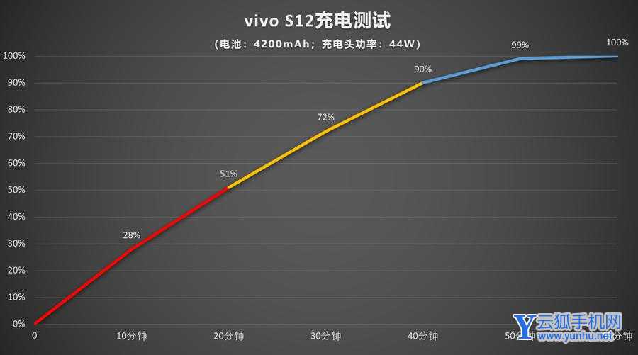 充电方面,手机电量耗尽自动关机后开始充电测试,10 分钟就能达到 28% 的电量,30 分钟达到 72% 的电量,达到 100% 电量用时 53 分钟。
