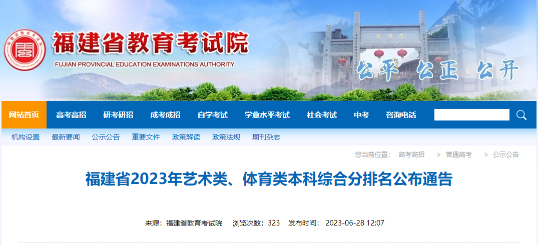 2023年福建省艺术类、体育类本科综合分排名公布通告06-29