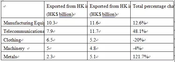 Secondly, we can also see that the value of exported metals, telecommunications and manufacturing equipment increased generally. To be specific, the value of exported metals more than doubled from 2.3 billion HK dollars to 5.1 HK dollars. Meanwhile, the value of telecommunications increased dramatically to 11.6 billion HK dollars by 48.1%, overtaking that of manufacturing equipment (11.7 billion HK dollars) and becoming the highest among these five types of goods.