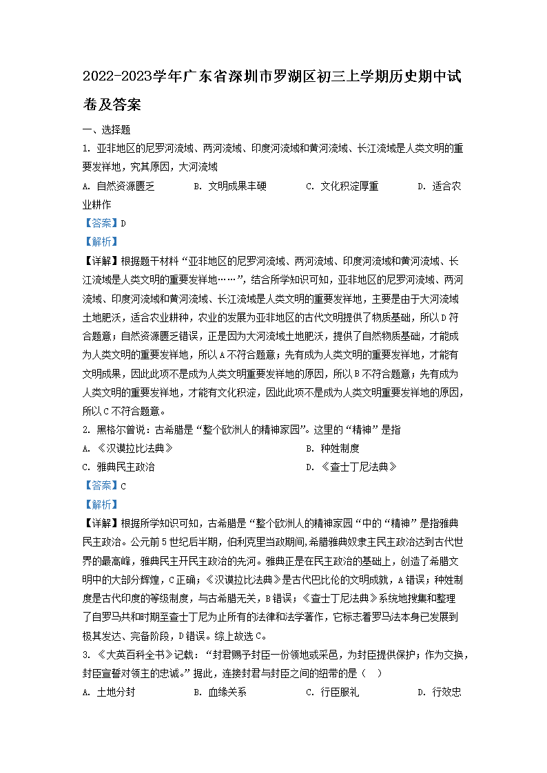 2022-2023学年广东省深圳市罗湖区初三上学期历史期中试卷及答案(Word版)08-18