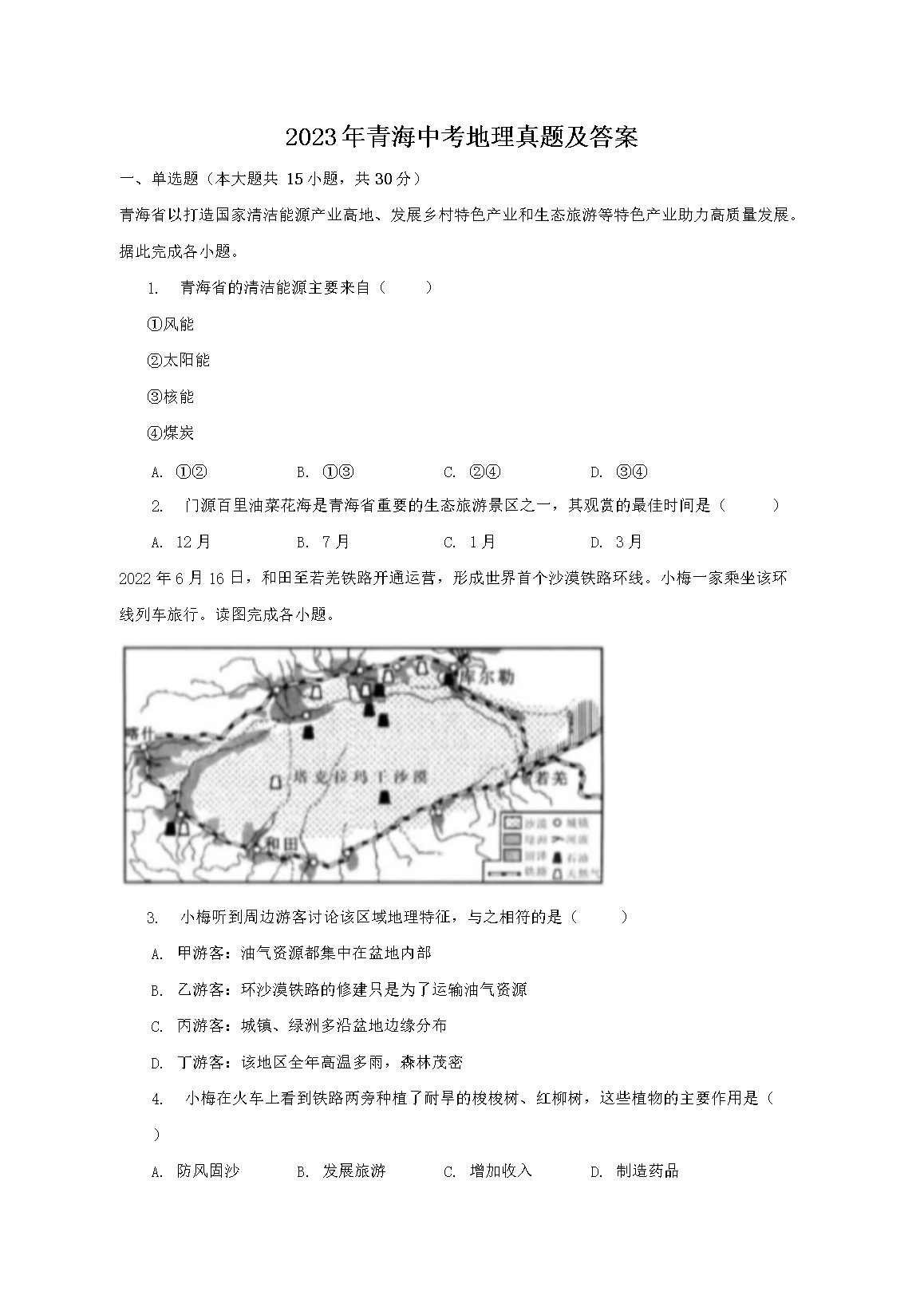 【文档预览】 文档大全网整理发布2023年青海中考地理真题及答案(Word版),前五页预览如下:
