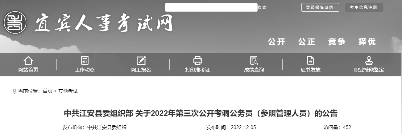 2022年第三次四川宜宾中共江安县委组织部公开考调公务员公告(报名时间12月5日-14日)12-07