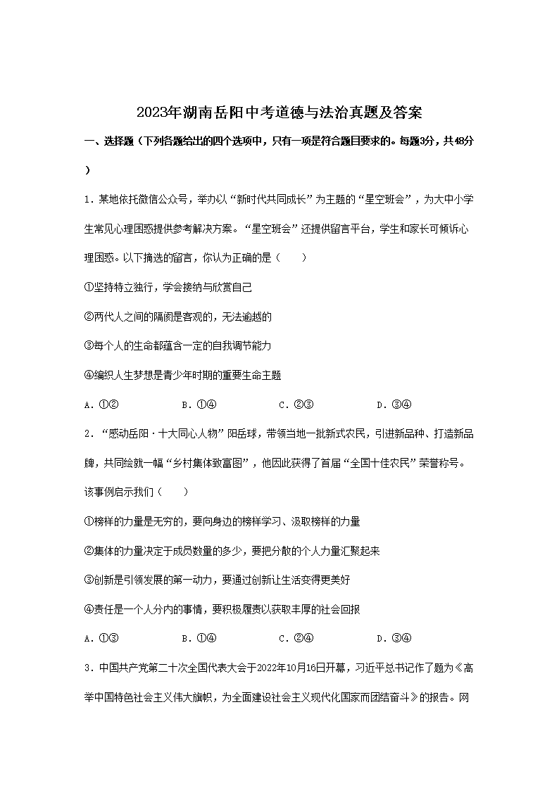 【文档预览】 文档大全网整理发布2023年湖南岳阳中考道德与法治真题及答案(Word版),前五页预览如下: