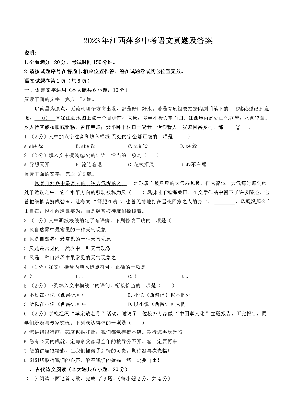 【文档预览】 文档大全网整理发布2023年江西萍乡中考语文真题及答案(Word版),前五页预览如下: