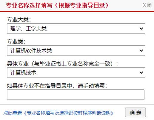 专业名称填写使用分级下拉框方式,先选择专业大类,再选择专业类,最后选择具体专业。如具体专业不在选项中,请手动填写具体专业名称。