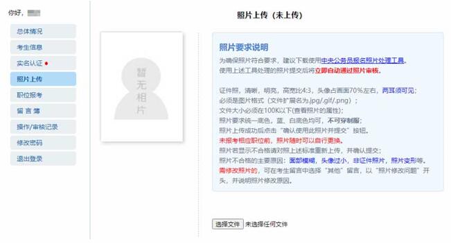 注意:报考者对照片质量负责,并确保为本人照片,如因照片质量影响考试的,一切后果由报考者本人负责。