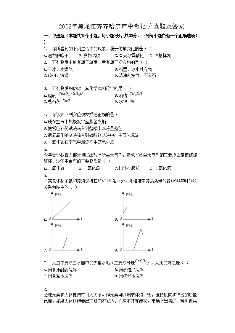 【文档预览】 文档大全网整理发布2002年黑龙江齐齐哈尔市中考化学真题及答案(Word版),前五页预览如下: