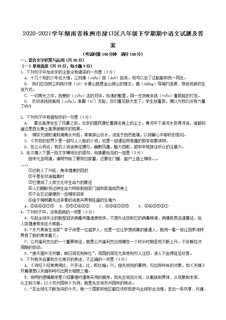 【文档预览】 文档大全网整理发布2020-2021学年湖南省株洲市渌口区八年级下学期期中语文试题及答案(Word版),前五页预览如下: