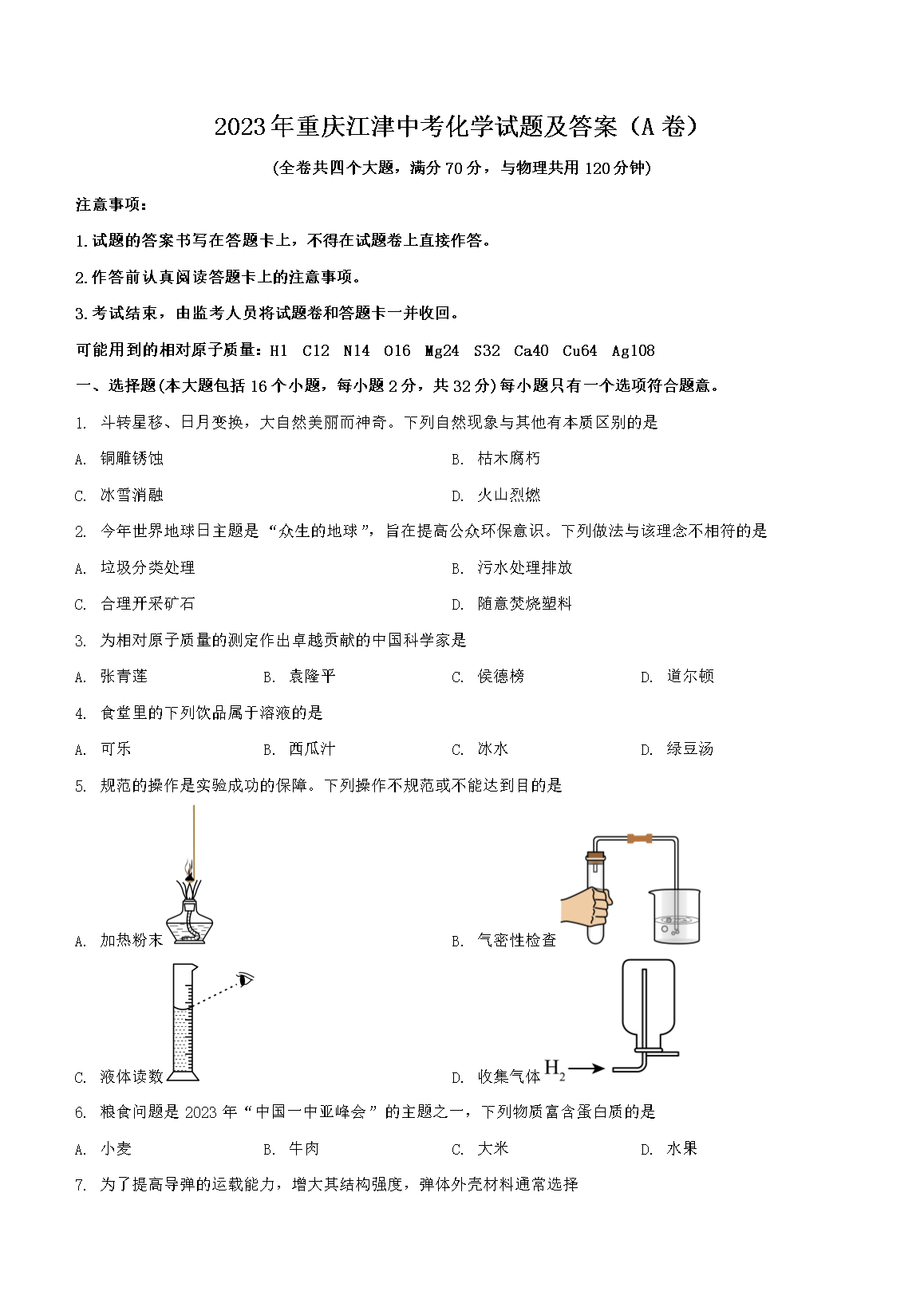 2023年重庆江津中考化学试题及答案(A卷)(Word版)06-19