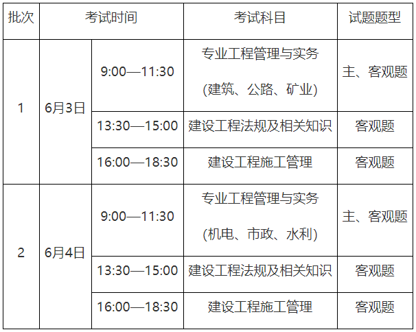 考试按《专业工程管理与实务》科目所选专业分2天2个批次实施,具体考试时间见表格。