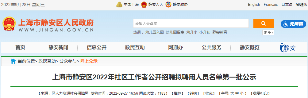 2022年上海市静安区社区工作者公开招聘拟聘用人员名单第一批公示09-29