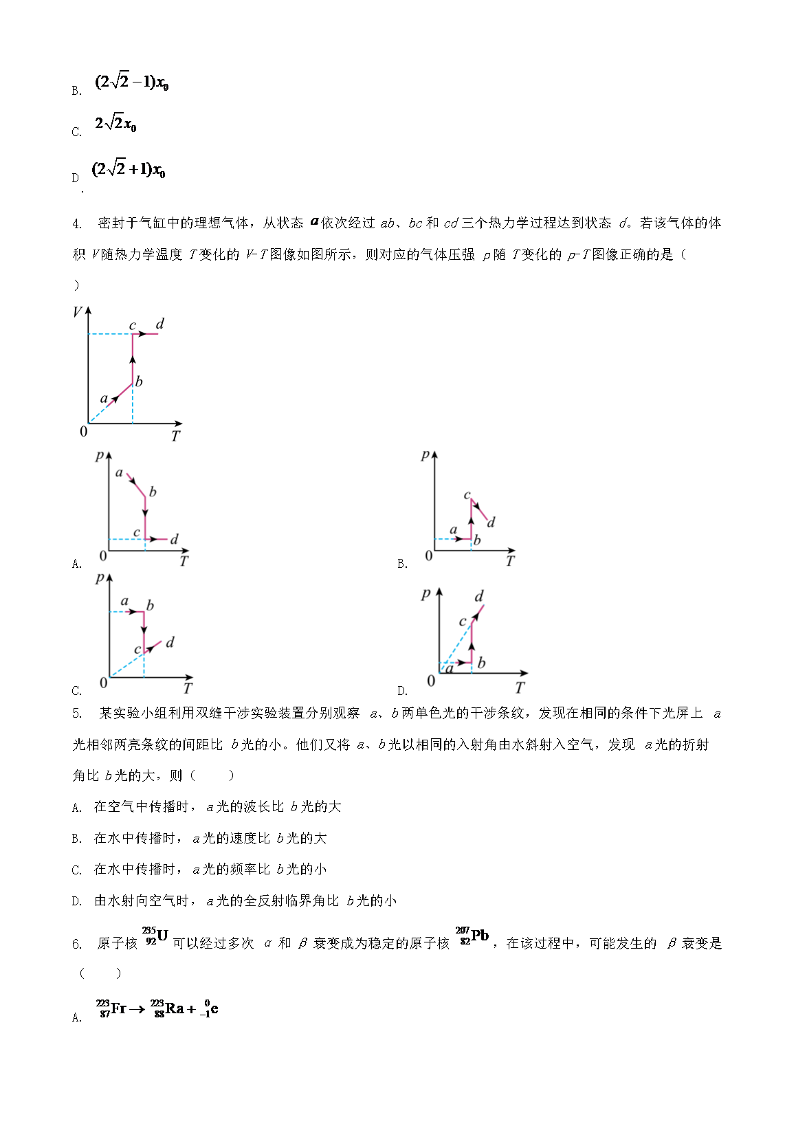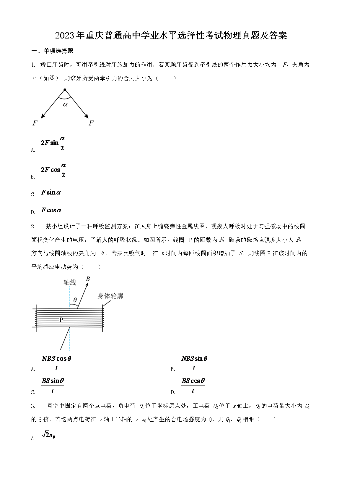 2023年重庆普通高中学业水平选择性考试物理真题及答案(Word版)09-16