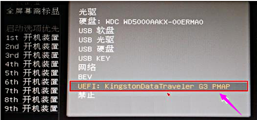 5.在启动项列表中包括了硬盘、u盘,我们只需选择带有uefi前缀的u盘选项,然后回车确认保存后,便可看到“1st开机装置”右侧出现的变化(中括号内变成了我的u盘即我的u盘已经设为了第一启动)。