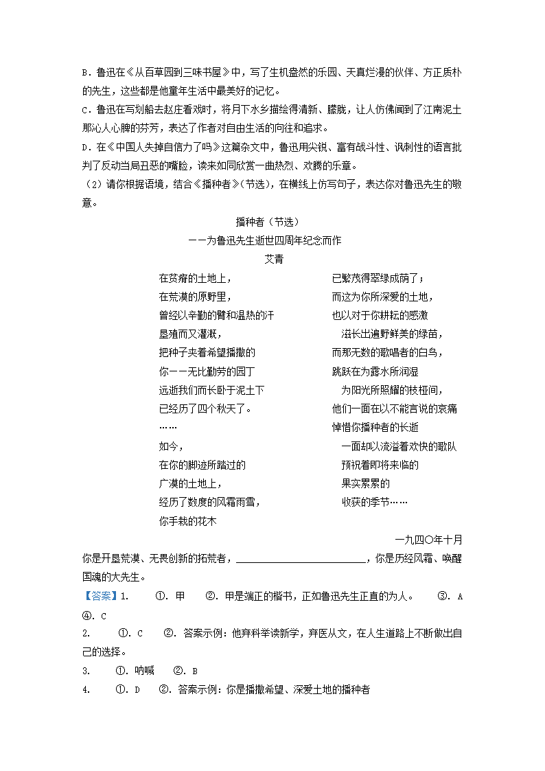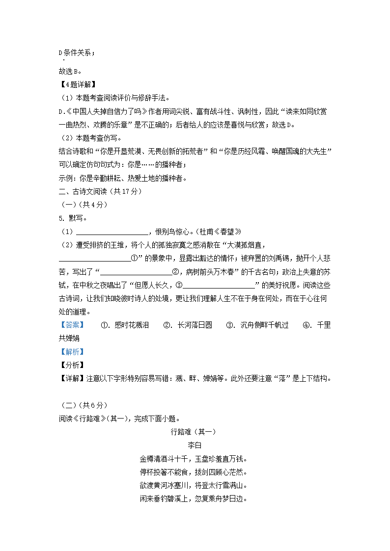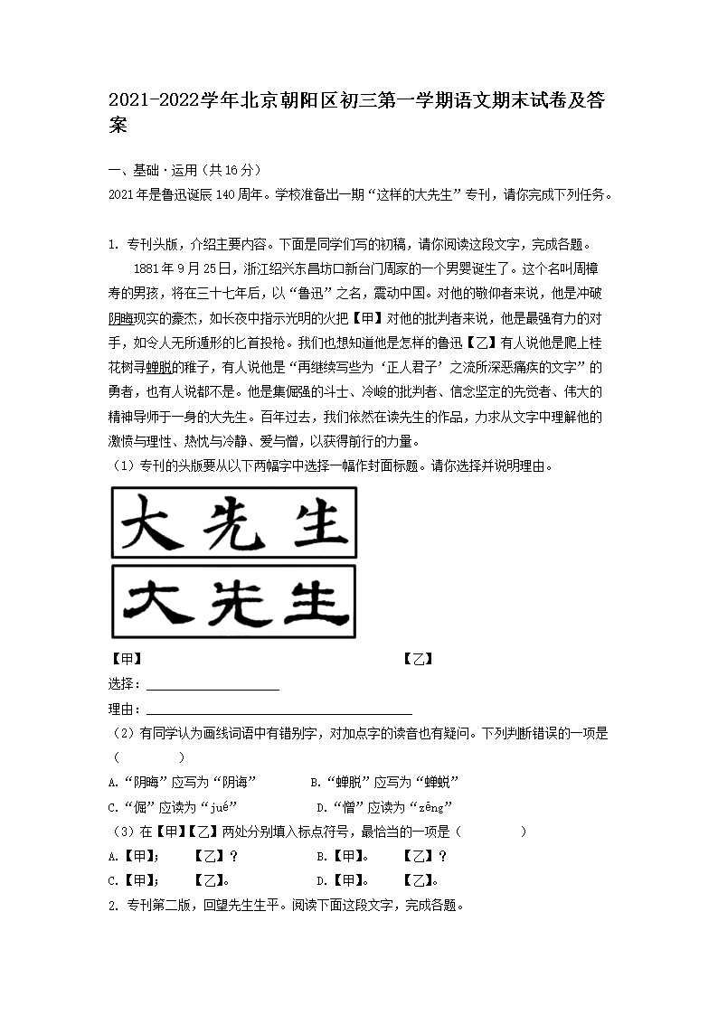 2021-2022学年北京朝阳区初三第一学期语文期末试卷及答案(Word版)06-28