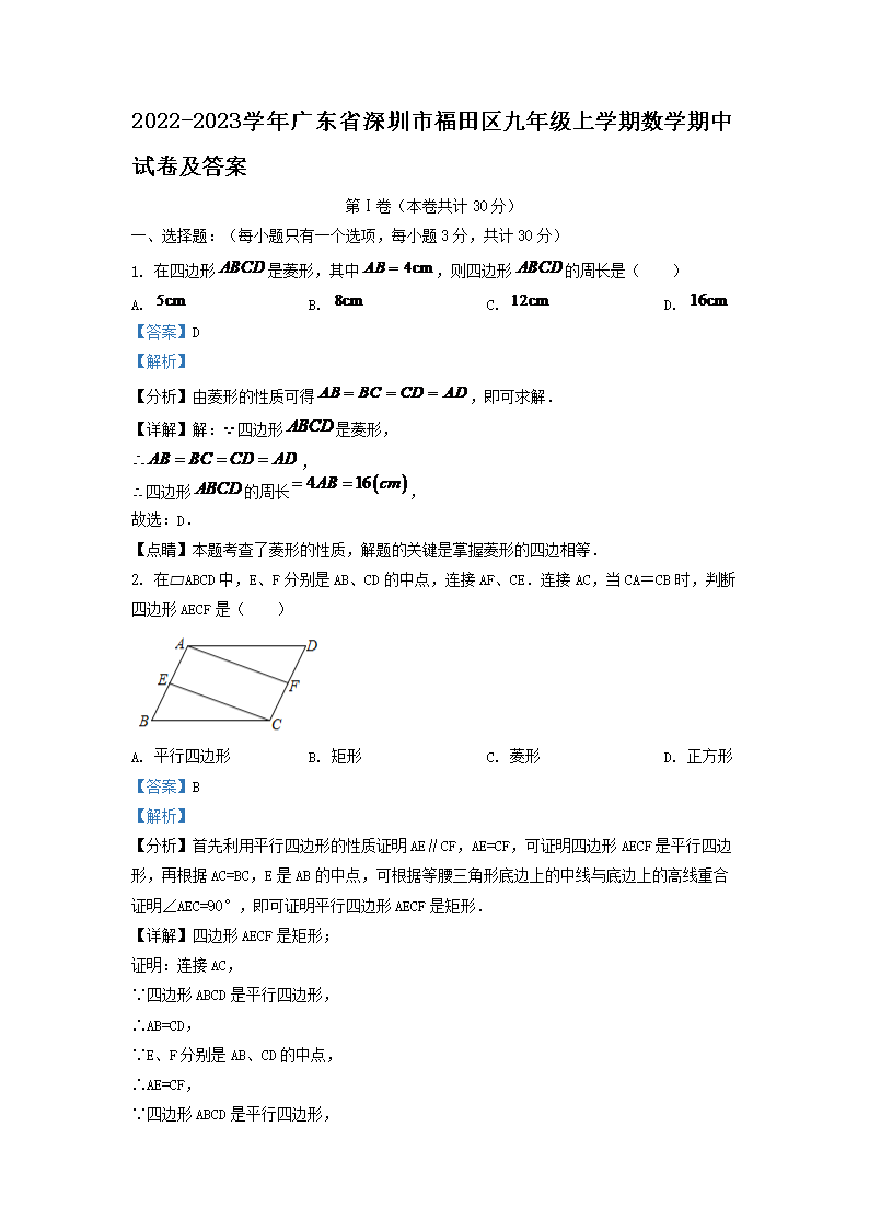 【文档预览】 文档大全网整理发布2022-2023学年广东省深圳市福田区九年级上学期数学期中试卷及答案(Word版),前五页预览如下:
