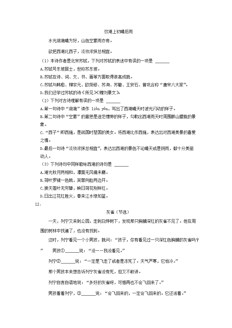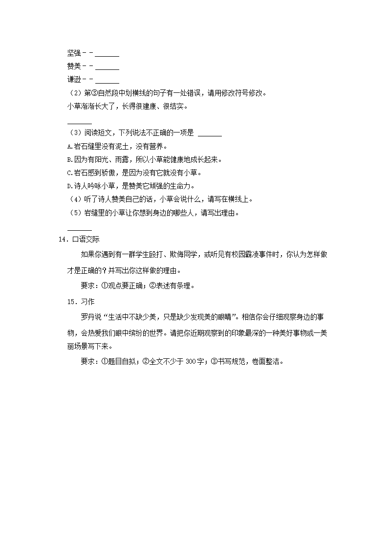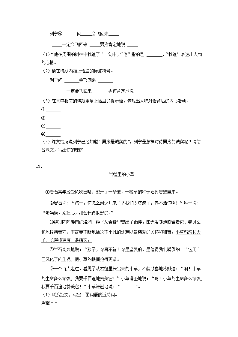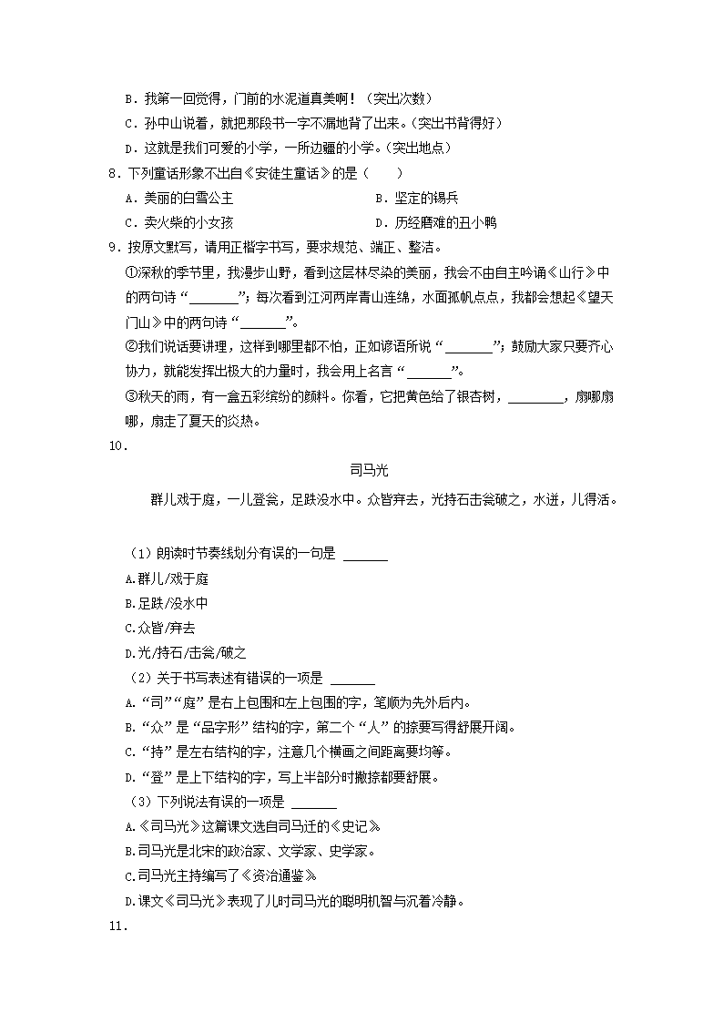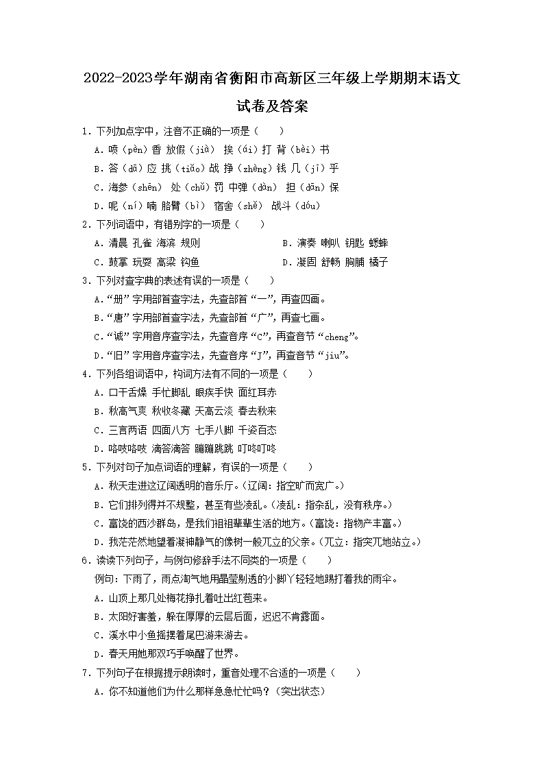 2022-2023学年湖南省衡阳市高新区三年级上学期期末语文试卷及答案(Word版)09-26