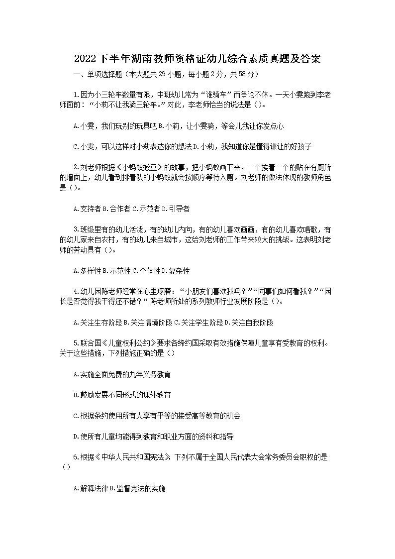 2022下半年湖南教师资格证幼儿综合素质真题及答案(Word版)06-02