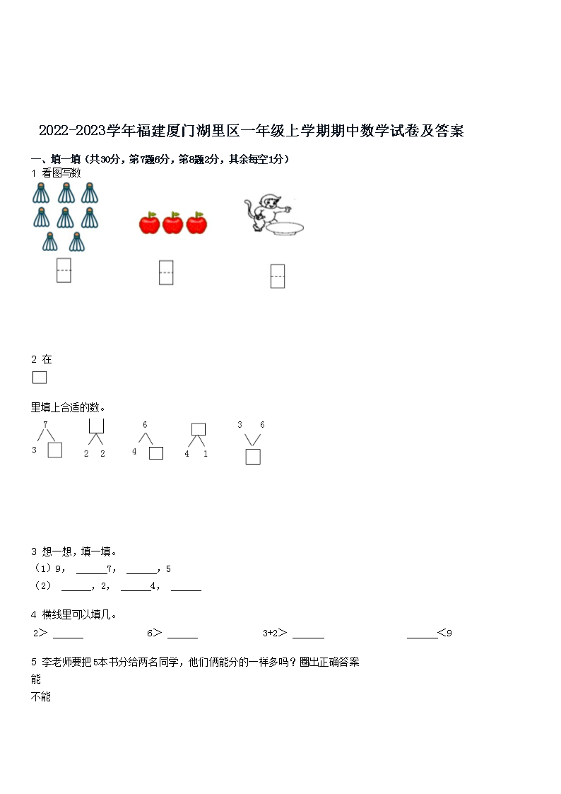 【文档预览】 文档大全网整理发布2022-2023学年福建厦门湖里区一年级上学期期中数学试卷及答案(Word版),前五页预览如下: