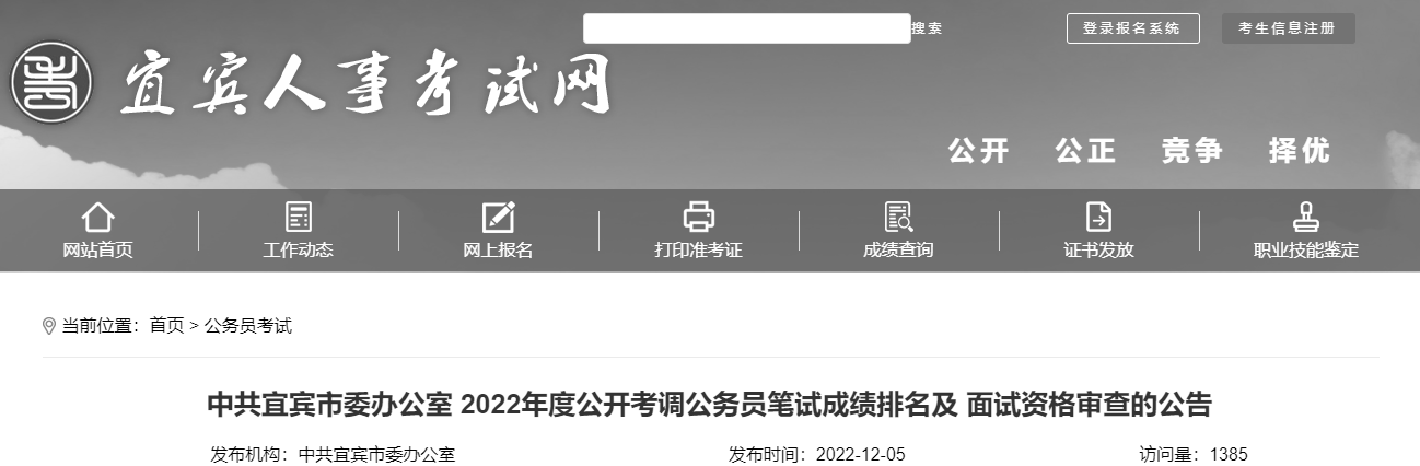 2022年四川中共宜宾市委办公室考调公务员成绩排名及面试资格审查公告12-07