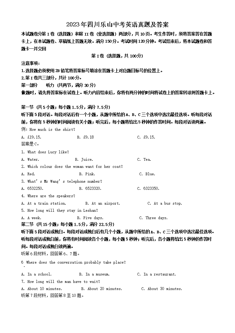 【文档预览】 文档大全网整理发布2023年四川乐山中考英语真题及答案(Word版),前五页预览如下: