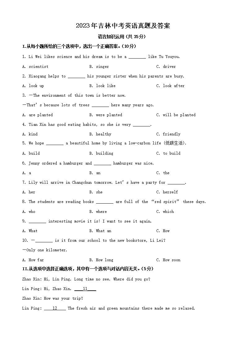 2023年吉林中考英语真题及答案(Word版)07-11