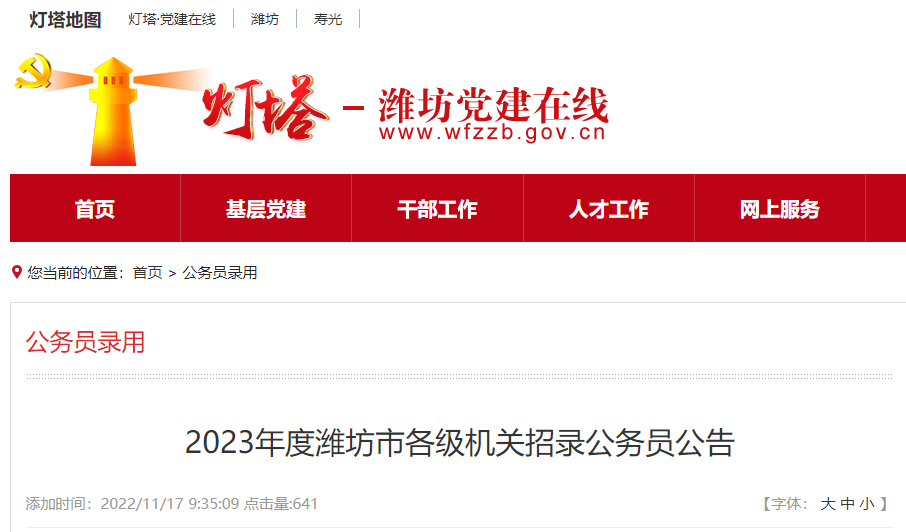 【#公务员考试# 导语】®文档大全网从灯塔-潍坊党建在线获悉,2023年山东潍坊市各级机关招录公务员报考工作现已开始,报名时间:2022年11月19-22日,考试时间:2022年12月17日,更多事宜请参考阅读《考试公告》,官方公告原文如下: