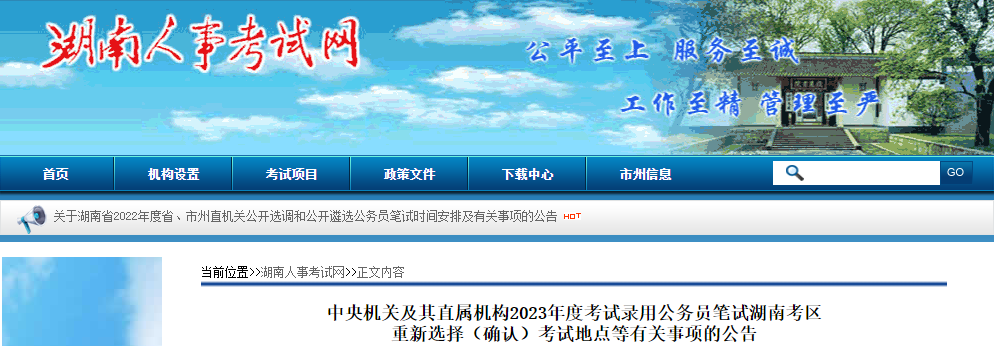 国家公务员局发布公告,中央机关及其直属机构2023年度考试录用公务员笔试定于2023年1月7日、8日举行。现就湖南考区重新选择(确认)考试地点等事项公告如下: