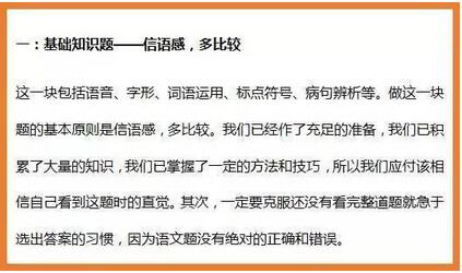 初中语文试卷可以把它分为八块,基础知识题、科技文阅读、文言文选择题、文言文翻译诗歌鉴赏题、现代文阅读、语言表达题和作文,每一块知识点,都有一定的做题方法和做题思路。