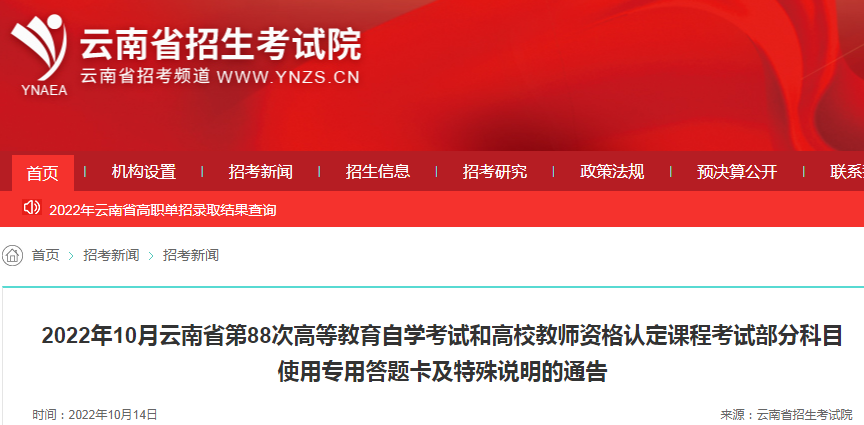 2022年10月云南省第88次自学考试部分科目使用专用答题卡及特殊说明的通告10-17