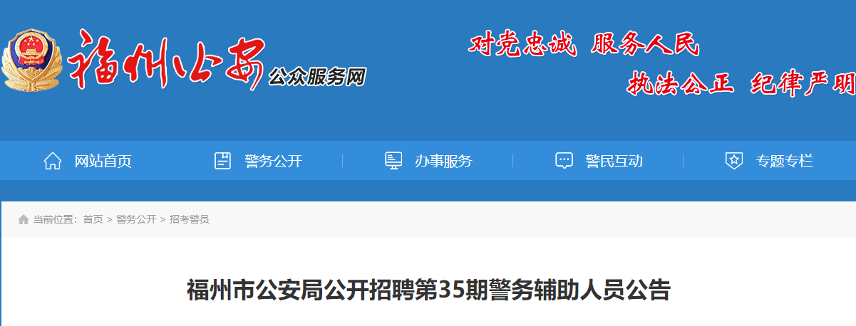 因工作需要,福州市公安局决定面向社会公开招聘第35期警务辅助人员,现将有关事项公告如下: