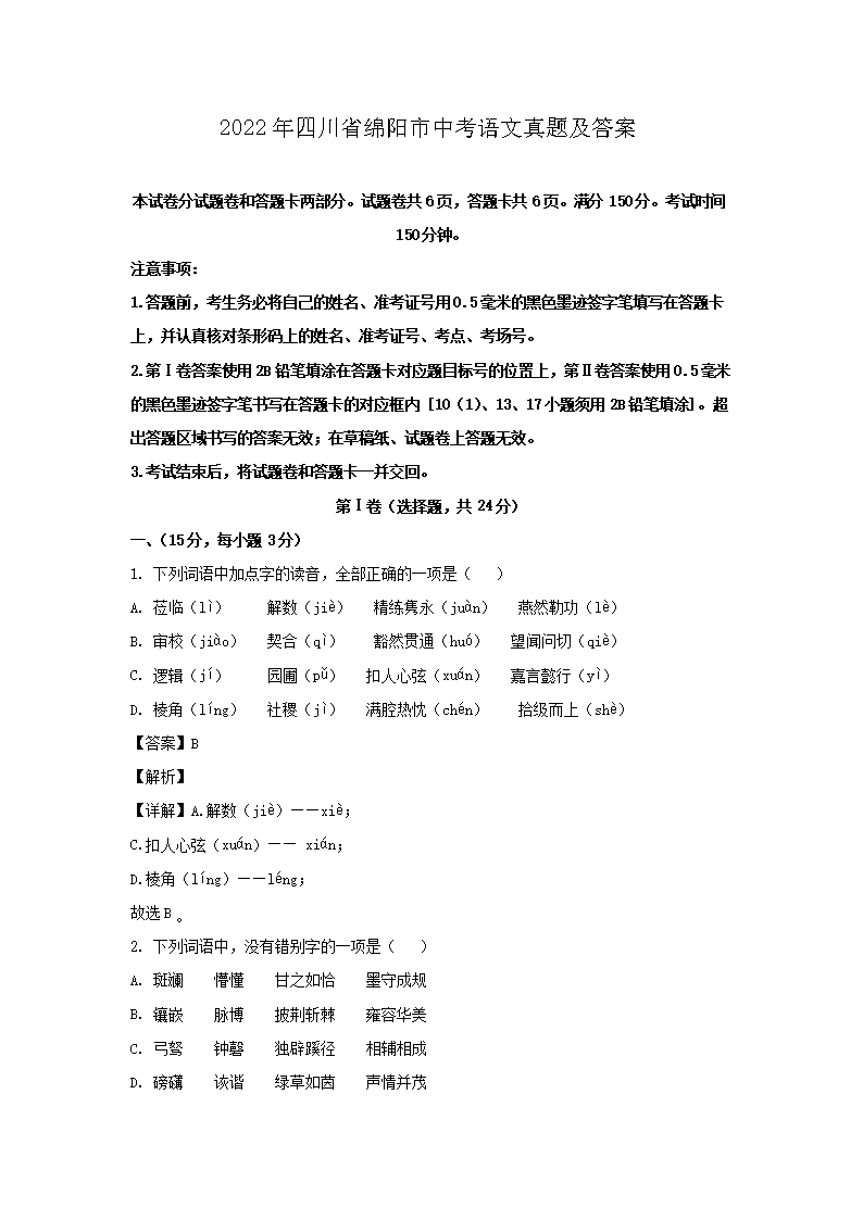 【文档预览】 文档大全网整理发布2022年四川省绵阳市中考语文真题及答案(Word版),前五页预览如下: