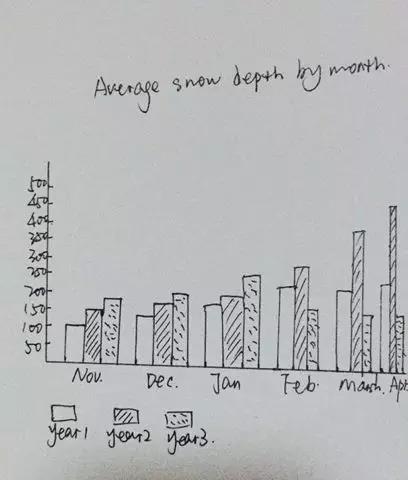 According to the chart, the amount of snow depth in November per year experienced a slow increase from 100 to 150, and the similar trend could be seen in December and January in which the amount of snow reach 150 and approximately 220 in the third year respectively.