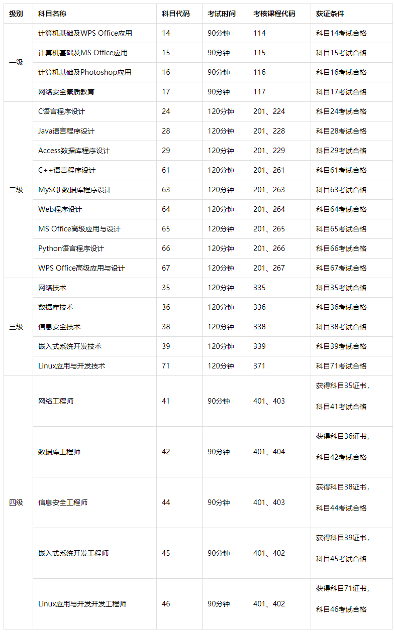 2022年暂停三级Linux应用与开发技术、四级Linux应用与开发工程师两个科目考试。2022年9月起,新增二级openGauss数据库程序设计(科目代码68)。