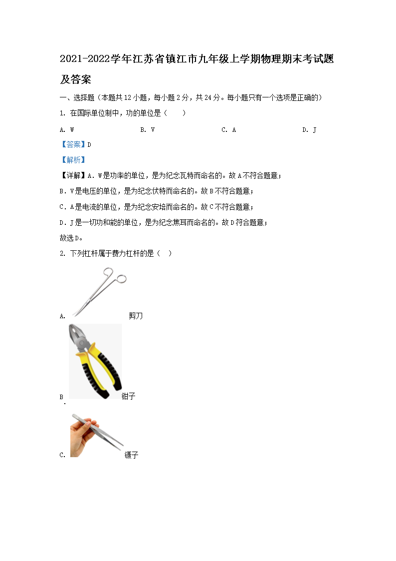 【文档预览】 文档大全网整理发布2021-2022学年江苏省镇江市九年级上学期物理期末考试题及答案(Word版),前五页预览如下: