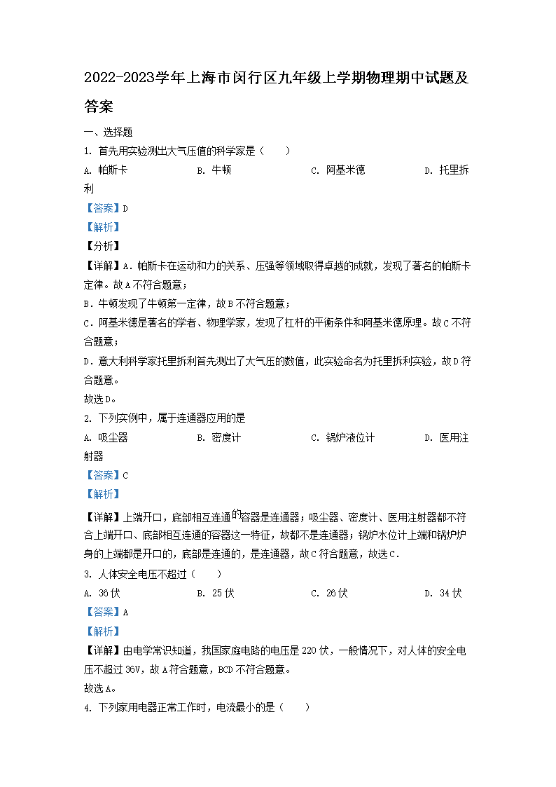 【文档预览】 文档大全网整理发布2022-2023学年上海市闵行区九年级上学期物理期中试题及答案(Word版),前五页预览如下: