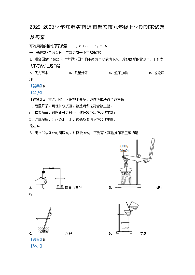 【文档预览】 文档大全网整理发布2022-2023学年江苏省南通市海安市九年级上学期期末试题及答案(Word版),前五页预览如下: